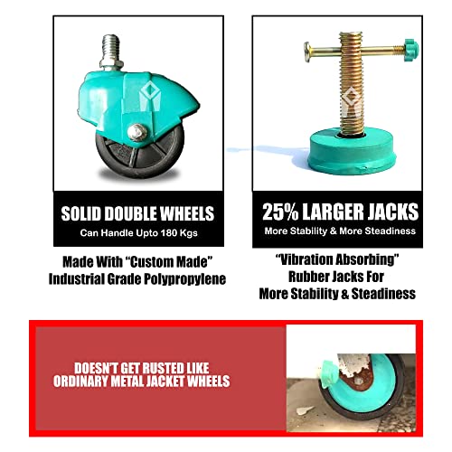 Anti Vibration Stand – More Sturdy & Stable With 25% Larger Vibration Absorbing Jacks With 360 Degree Rotatable Double Wheels : Being on top of the list of washing machine parts, this universal washing machine stand top load / front load comes with 25% larger rubber stopper / rubber jacks that absorb vibrations and provide a stable base, which is then accompanied by 4 pair of industrial grade PP double wheels which can move with up to 180kg of weight easily.