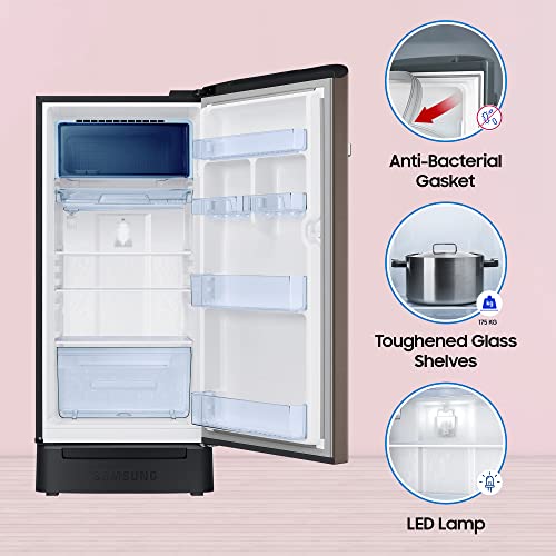 Interior Description : Fresh Food Capacity : 171L | Freezer Capacity : 18L | Total No Of Compartments : 1 | Drawers : 1 EA | Shelves : 2 EA | Shelf Type : Toughened Glass Shelves | Anti-Bacterial Gasket | Bottle Storage Capacity : 5 | Base Stand With Drawer For Additional Space For Non-Refrigerated Food Items
