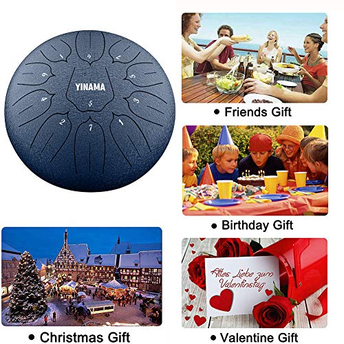 Yinama Steel Tongue Drum 11 Notes 12 inches lotus flower style. There are no wrong notes, you will be played enough beautiful overtones by Hitting with your hand or drum mallets.Protective lacquer finish guards against tarnishing, scuffs, and scratches.Silicone feet stabilize the drum’s position during playing. Great for Camping, Yoga, Meditation, Music Therapy snd parties. And also can be used a interior decoration to make your indoor nice and cozy.